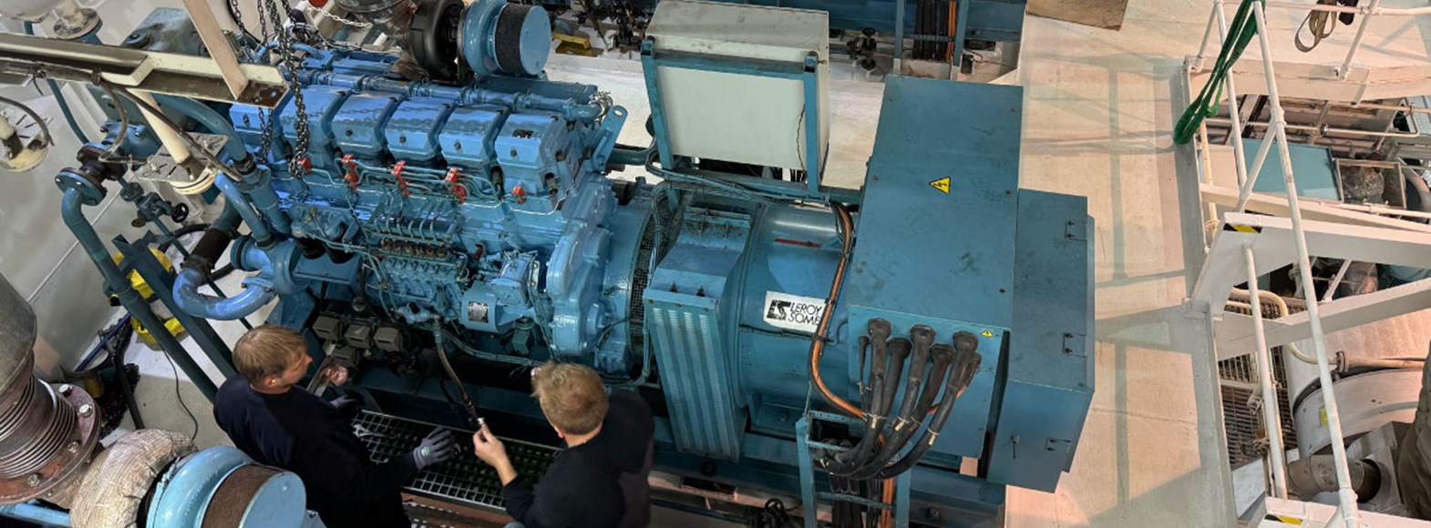 Mitsubishi S6R merigeneraattorin huolto, jossa on Mitsubishi-moottori ja Leroy Somer -vaihtovirtageneraattori